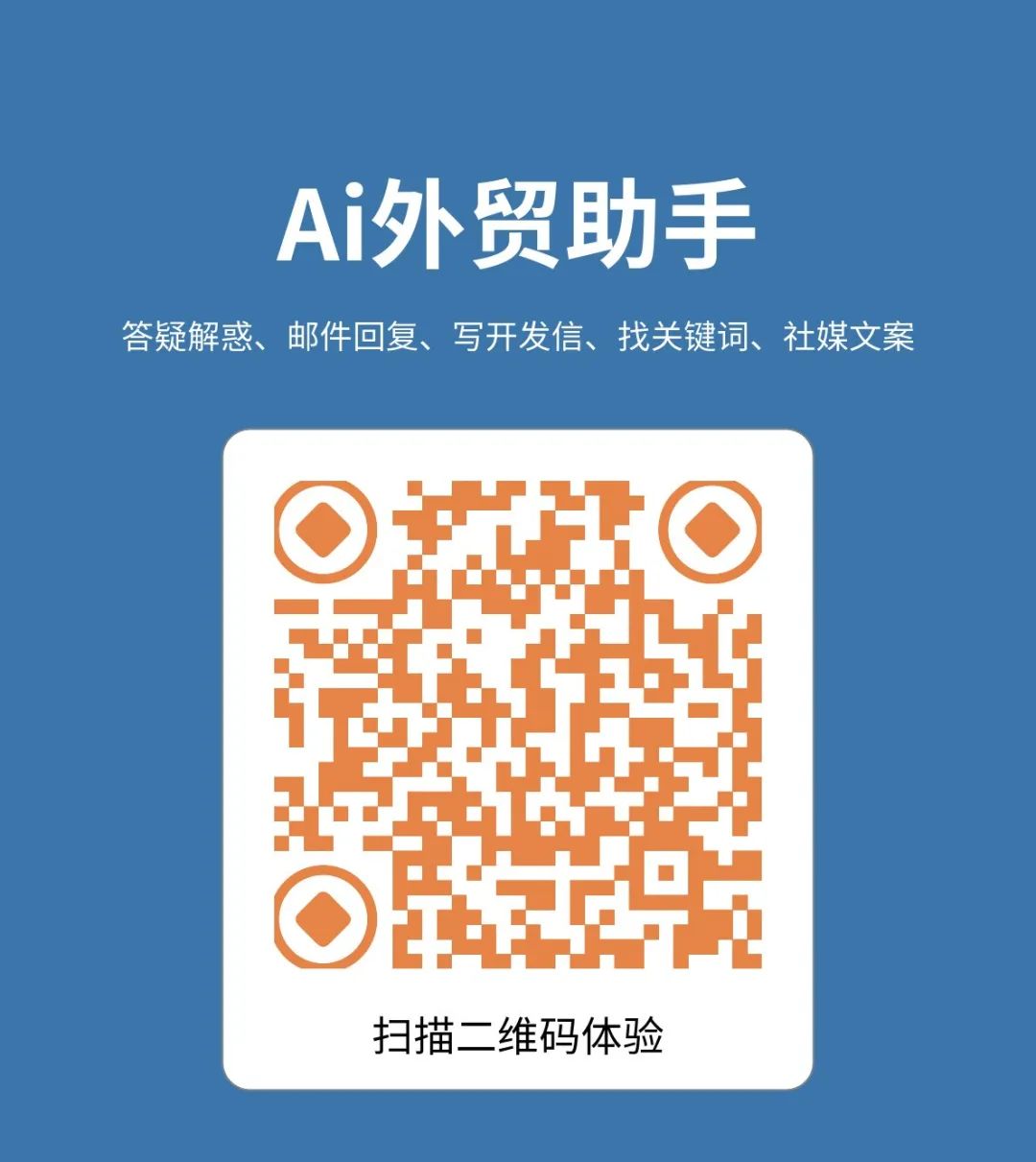Ai外贸助手:答疑解惑、邮件回复、多语言互译、挖掘关键词、写标题、写开发信、写社媒文案、市场调研!更多惊喜等你体验!