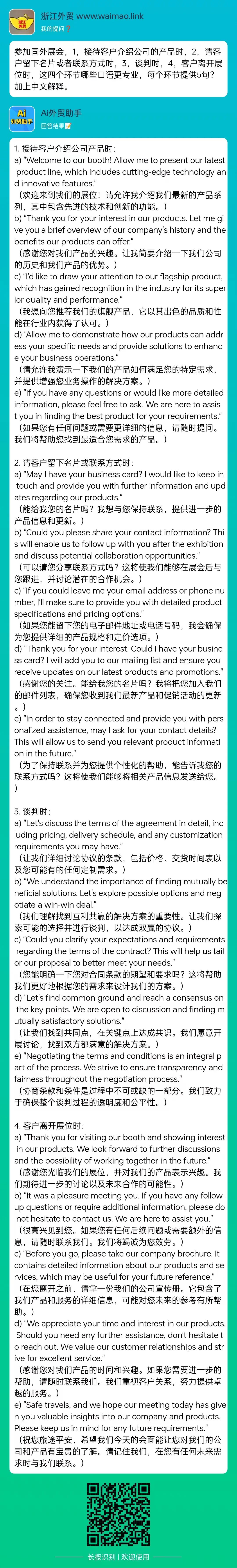参加国外展会,1,接待客户介绍公司的产品时,2,请客户留下名片或者联系方式时,3,谈判时,4,客户离开展位时,这四个环节哪些口语更专业,每个环节提供5句?加上中文解释。