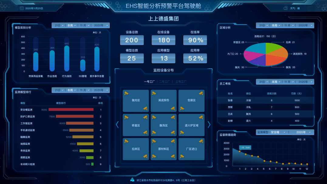 【严冬云】好的,主持人。作为企业法人,我最关心安全问题,“安全智管”子场景聚焦本行业安全事故特征以人的行为和物的状态创建了25类本行业安全标准模型,并依托AI模型算法精准预警、闭环处置!当监测到员工未佩戴安全帽时,应用自动激活员工工作服震动器及时提醒员工纠错!系统抓拍的每份图像再次通过AI识别算力技术自动转换成分析数据:一屏掌控企业“安全隐患发生区域、类别、工伤费用、安全隐患预警等这些信息,他会自动产生企业的风险评估安全等级报告,为企业的风控库风险研判库和员工精准培训提供参考。
