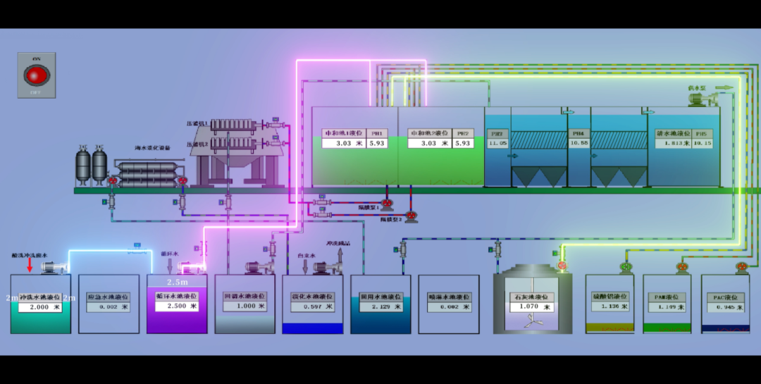 “环保智控”子场景,可以一屏掌控废水处理动态,各污水处理池、中和池全都装有雷达液位计、PH值传感器等物联感知设备。当水位、PH值浓度偏离预值区间时,场景自动反馈到设备的防错层、防控层、执行层进行修正!当雷达液位计感知水位偏高时,自动调节进水阀门的大小,防止污水外溢;监测到PH值浓度异常时,中和池自动投放片碱石灰计量,确保污水中和、沉淀、氧化等环节达标处置后的回用水自动通过高级排程系统,用于“酸洗、退火”两个工序!每天只要补20吨水就能产出300万的产值!智能环保监造系统上线以来,污水污气实现零排放,万元能耗由0.504降至0.41。