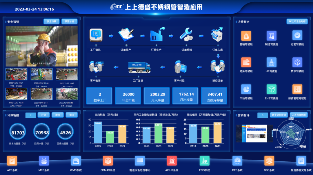【严冬云】我们上上德盛集团股份有限公司是一家具有22年专业制造中高端工业级不锈钢管道制品的公司,产品是为中国大器项目上提供工业级耐超高温、耐超低温和耐高防腐管,我们在品牌战略中一直追求两种责任担当:产品责任和社会责任。在2014年开始至今的8年时间,我们坚持以数字化改革战略提升企业发展的理念,自主开发了12套系统,来解决安全生产监管难、环保管控处置难、营销提质增效难、决策精准研判难4大难题。