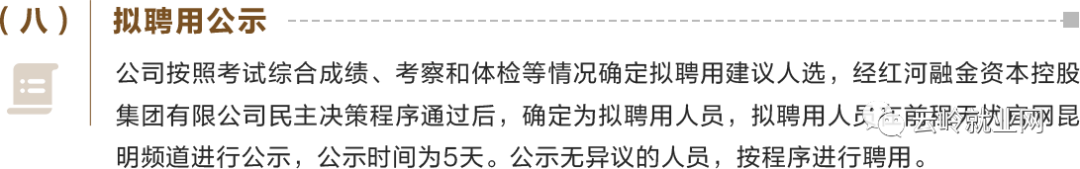 (一)资格审核贯穿招聘始终,在任何环节发现应聘人员违反招聘规定,出现提供信息、证件造假或作弊等情况,一经查实将取消聘用或解除聘用合同。(二)红河融金资本控股集团有限公司有权根据岗位需求变化及报名情况等因素,调整、合并或取消个别岗位的招聘工作。(三)本次招聘实行诚信承诺制,应聘人员须遵守和满足此次公开招聘的政策规定,承诺完全满足应聘岗位要求的条件,诚信参与招聘工作的各个环节,提供真实有效并与招聘岗位相符的证件,不违纪违规,不随意放弃,不浪费考试资源。拟聘用人员公示结束后放弃的,取消录用资格,且3年内不得报名参加红河融金资本控股集团有限公司招聘。(四)本公告最终解释权归红河融金资本控股集团有限公司所有。招聘咨询电话:0871-68010700转689、677(周一至周五,9:00-17:00)本次招聘工作实行信息公开、过程公开、结果公开,主动接受纪检监察部门和社会监督。