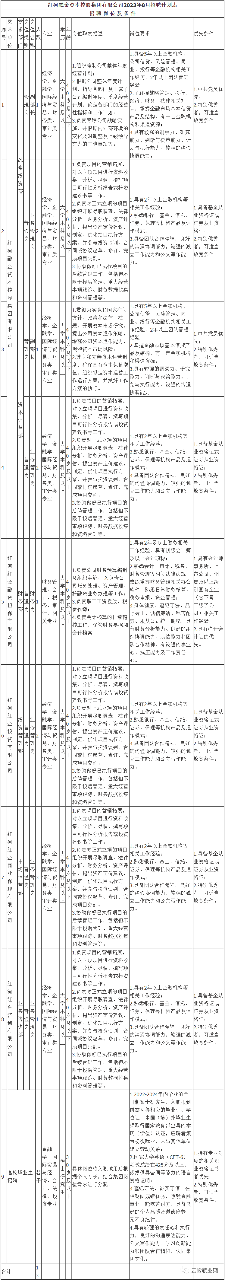 红河融金资本控股集团有限公司于2021年8月成立,是由红河州财政局代表红河州人民政府履行出资人职责的州属国有独资企业,注册资本10亿元,下设4个二级子公司。红河融金集团以打造地方金融体系为目标,业务涉及融资担保、融资租赁、基金、保理、咨询、供应链金融等金融业务,形成功能相对完善、协同服务能力强的综合性金融服务体系。公司通过股权投资和资本运营,引导更多的社会资本投向红河州经济发展的关键领域和重点项目,助推团结进步美丽红河建设和实现高质量跨越式发展。现结合公司实际,面向社会招聘工作人员。坚持公开、公平、公正的招聘原则;坚持竞争、择优的选人原则;坚持考试与考察相结合的原则。计划面向社会招聘8个岗位,需求13人;高校毕业生招聘若干人。具体岗位信息及岗位任职资格条件详见《红河融金资本控股集团有限公司2023年8月公开招聘计划表》 (附件1)