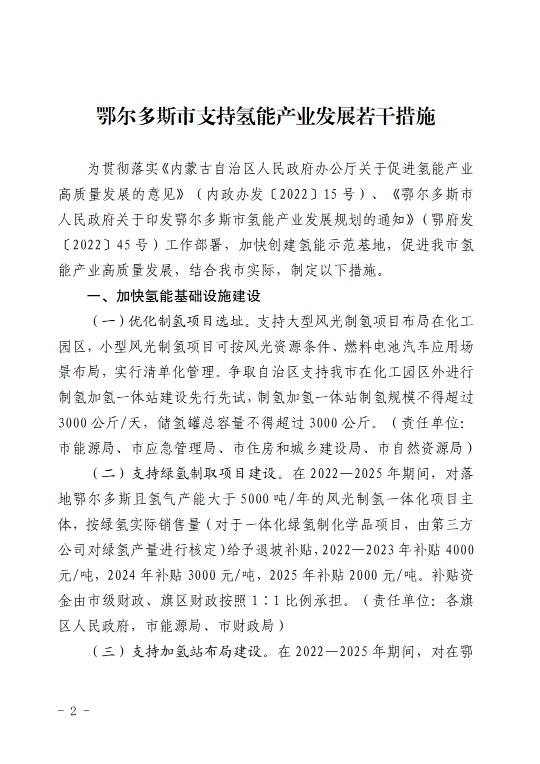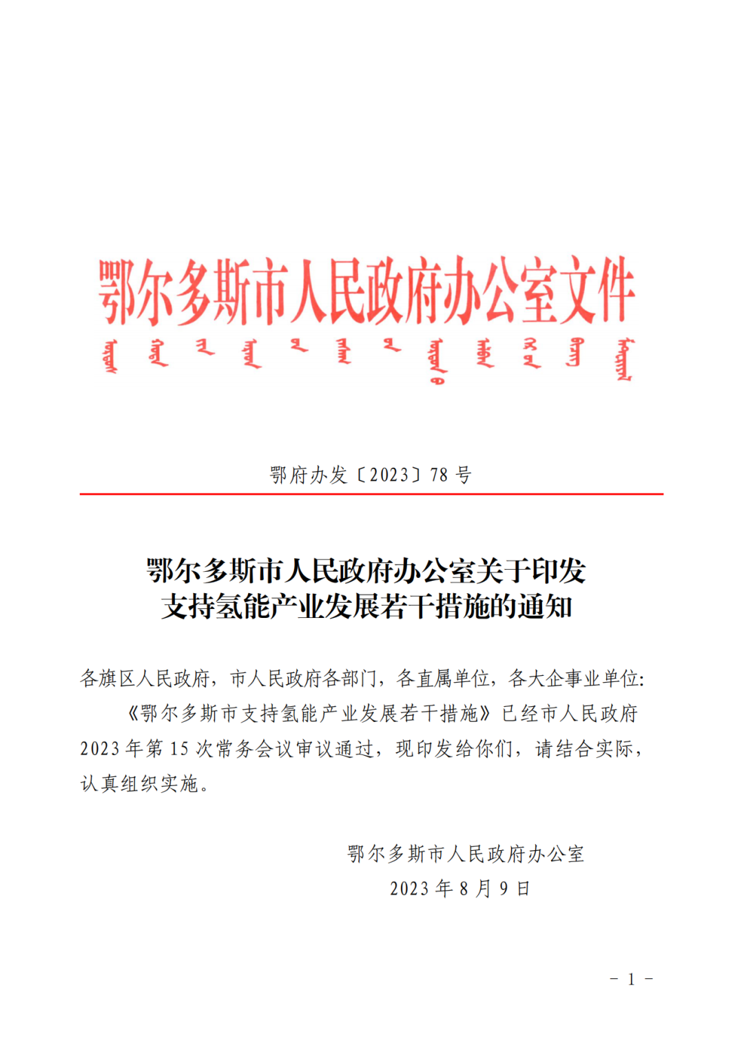 8月10日,内蒙古鄂尔多斯市人民政府办公室发布《关于印发支持氢能产业发展若干措施的通知》。