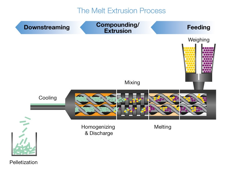 HME制备药物固体分散体的基本原理是,通过将固体药物和载体等辅料输送进设备中,经过加热熔融、剪切混合、排气匀化、熔体输送、挤出成型等众多单元操作,即在强剪切力和套筒提供的热能作用下,使多组分物料的粒径不断减小,充分混合,促进药物更均匀地分散在载体中,形成ASD,然后以一定的压力和速度挤出,通过出口处模孔对其赋型,冷却定型,即得具一定形状的SD。 图1 热熔挤出过程示意图(图片来源于网络)