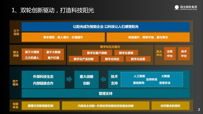 阳光保险集团科技中心副总经理、阳光人寿CIO王睿首先代表阳光保险集团感谢云联盟对阳光保险集团的支持和帮助,在这么短的时间内组织了30家优秀科技企业参加本次会议,并欢迎与会科技企业参会。王睿总首先从行业市场规模、行业技术投入,市场新洞察、大数据应用,科技生态建设和阳光保险未来发展规划方向、目标以及业务场景的技术需求等内容分享了他的最新观察和思考。王睿强调:阳光保险集团是一家拥有财险、寿险、信保、资产管理等全品类的保险集团公司。集团制定了“让阳光成为智能企业” 的战略,将在原有自主开发核心系统的基础上,积极向科技公司开放丰富的业务应用场景,实现内、外部技术双轮驱动发展,并将会围绕“数据和智能应用”方向,面向科技企业开放技术生态环境、组织相关技术交流、制定外部产品引入机制、开放场景、开放数据、以及项目孵化等。为此,今年阳光保险集团刚刚成立了“外部科技生态合作部”,负责外部科技生态合作链接,同时,还将筹划成立“保险科技专业组织”,并计划在11月份左右举办以“保险科技AI应用”为主题的科技大会。
