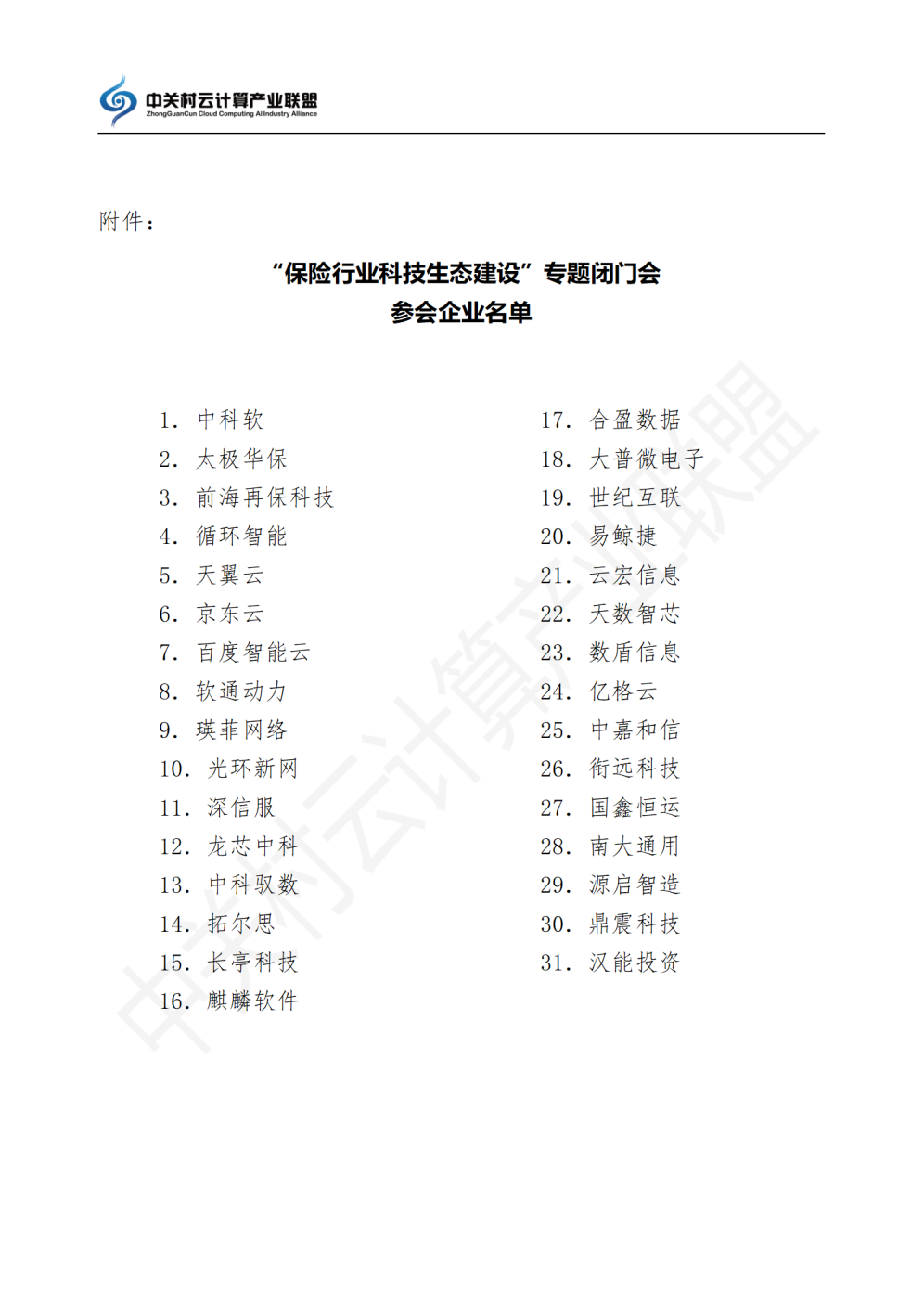 9月1日,一场旨在推动科技创新企业赋能保险行业科技生态建设和发展的合作交流闭门会,在中国云产业联盟暨中关村云计算产业联盟(以下简称“云联盟”)如期举办。云联盟执行会长兼秘书长龚梅,阳光保险集团科技中心副总经理、阳光人寿CIO王睿以及来自中科软、太极华保、前海再保科技等保险科技领域领军企业,以及天翼云、京东云、百度智能云等科技产业头部企业共30家云联盟成员企业参加了闭门会议,会议围绕“保险科技生态建设”、“场景开放、数据开放和项目孵化”、“保险科技生态大会”以及“保险行业专委会”的筹备等议题展开。