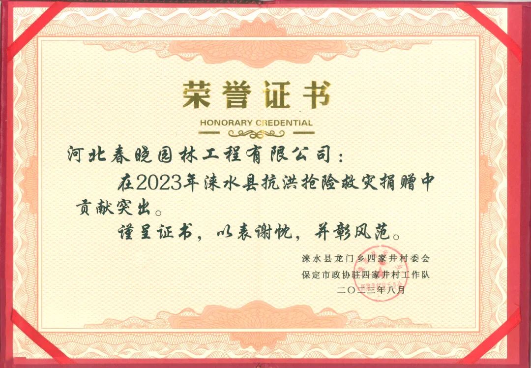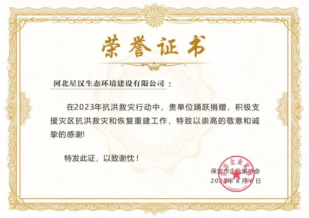 三、8月6日,星汉生态总经理李光通过保定市企业家协会向灾区捐款1000元支持抗洪救灾、恢复重建工作,并获得协会颁发的荣誉证书。