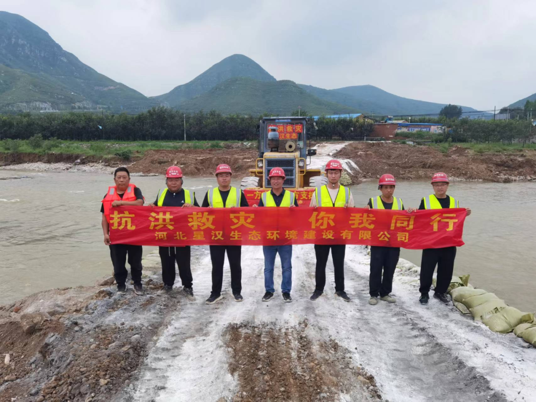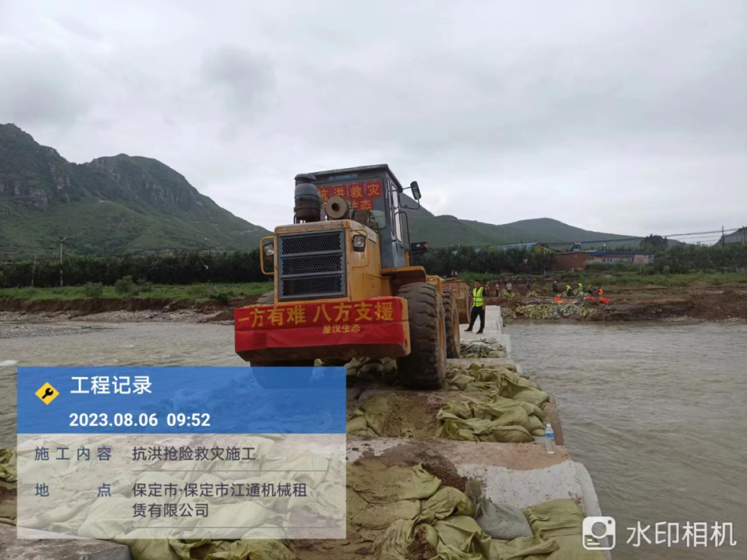 二、2023年8月4日下午3时,星汉生态接满城区区委、区政府指示,与满城执法局对接,对石井乡石井村、协义村等三个村临时西大桥进行抢修,总经理李光带领项目人员第一时间赶往现场勘察情况,立即进行施工部署,在人员紧张的情况下迅速从各项目抽调经验丰富的管理及技术人员组成由副总经理温梦学带队的7人抢险突击队。于当天连夜紧急调配人材机就位,经过两天两夜的艰苦奋战,8月6日晚9时,宽5m,长44.5m的钢筋混凝土管涵临时便桥搭设完成,解决了石井、协义等三个村的出行困难问题。8月7日上午在李光总经理的陪同下,满城区李区长、执法局孔局长、石井乡方书记,石井村王主任莅临现场,对修建临时便桥给予了充分肯定,星汉生态圆满完成抢险任务。