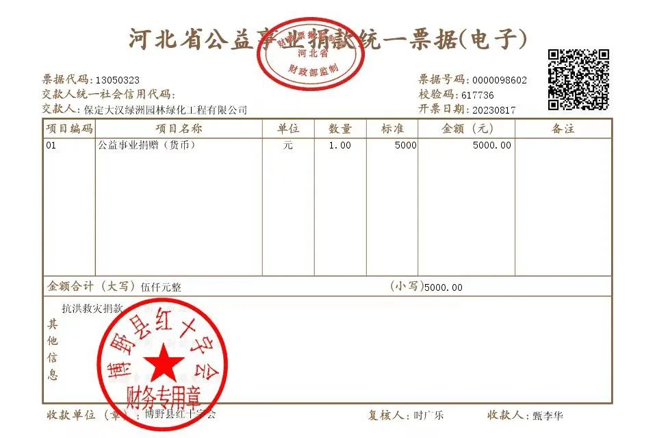 今年入汛以来,受强台风“杜苏芮”影响,我市部分县(市、区)发生洪涝灾害,给全市经济社会发展带来重大影响。特别是涿州市作为我市本次受灾严重的地区之一,水淹面积一度达到城区的60%,人民群众生命财产安全遭到极大损失。保定大汉绿洲园林绿化工程有限公司积极响应博野县政府号召,向博野县红十字会抗洪救灾捐款5000元,援助灾区,帮助受灾群众恢复生产、重建家园。