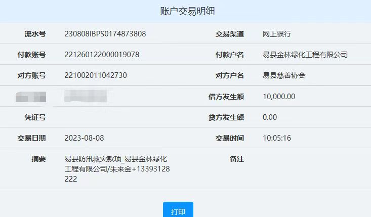 今年7月31日以来,我市多地遭遇强降雨,涿州、涞水、易县等部分地区更是遭遇严重的洪涝灾害,易县金林绿化工程有限公司总经理朱来金时刻关注着受灾地区,考虑到灾区人民的生活困境物和资短缺问题后,积极联系有关部门询问捐款捐物资渠道。并于8月8日向易县慈善协会捐款10000元。8月9日组织员工紧急筹备物资:面粉100袋、84消毒液100箱(400桶)、卫生纸100袋、矿泉水100件(折合人民币20000余元),发往易县安格庄乡人民政府,并亲自组织安排发放物资,确保物资真正分发到需要的人手中。