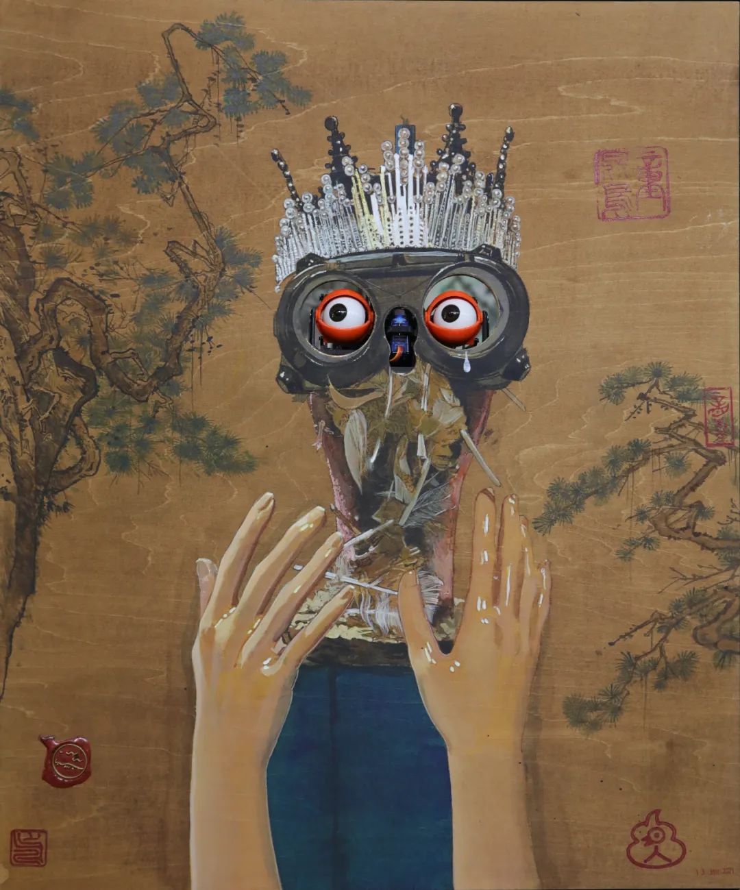 木板丙烯,3D打印机械眼睛,火漆 Acrylic on wood, 3D printing mechanical eyes, fire paint