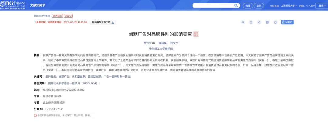 品牌性别;幽默广告;亲和型幽默;冒犯型幽默;广告—品牌形象一致性