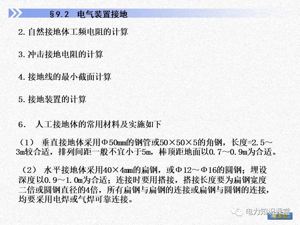 3.第二道防线就是要求可靠接地。接地是保证人身安全和设备安全而采取的技术措施。在正常或事故情况下,为保证电气设备可靠地运行,必须在供配电系统中某点实行接地,称为工作接地;出于安全目的,对人员能经常触及的、正常时不带电的金属外壳,因绝缘损坏而有可能带电的部分实行的接地,称为保护接地。其中,保护性接地中的类型主要有:防雷接地、保护接地、防静电接地和防电蚀接地;功能性接地中主要的接地类型有:工作接地、重复接地、屏蔽接地、逻辑接地和信号接地。接地装置由接地线与接地体两部分组成。接地体包括自然接地体和人工接地体,首先考虑自然接地体的利用,在其不满足热稳定条件时,再装设人工接地装置。