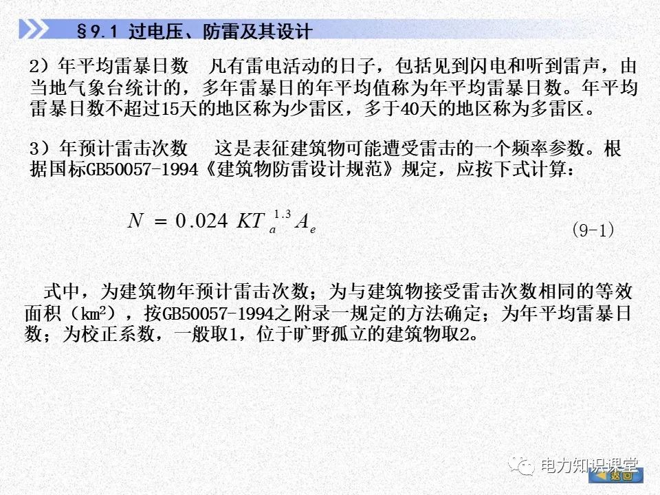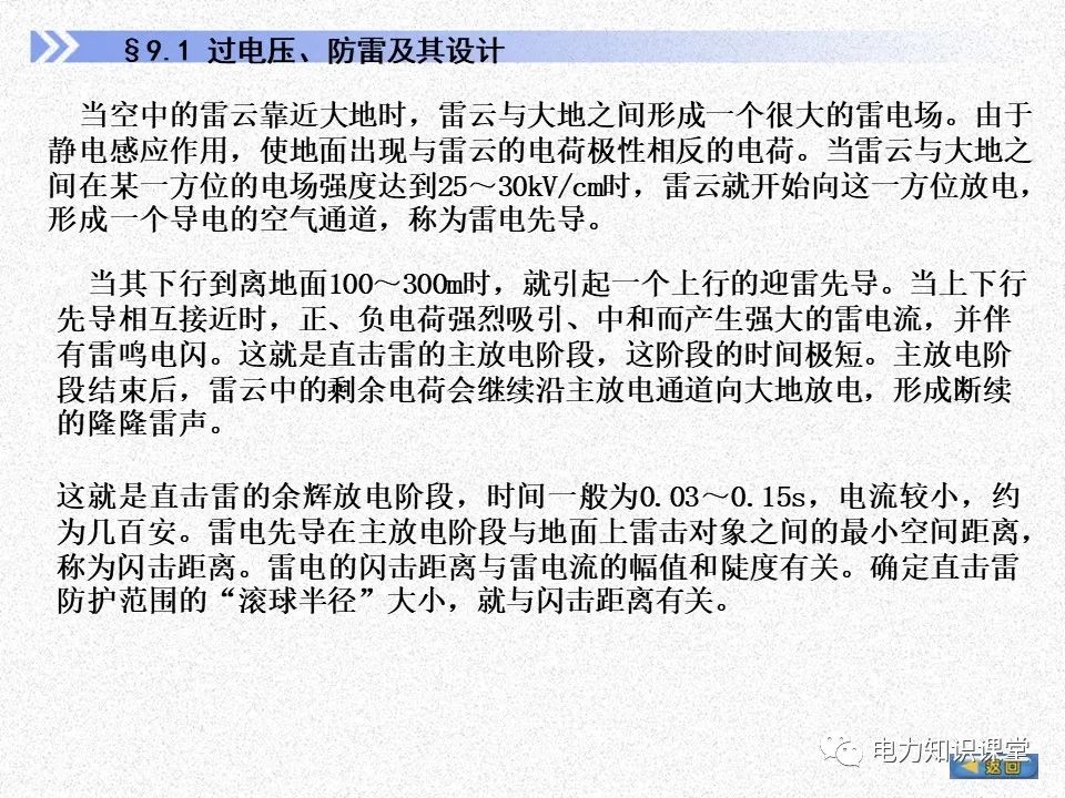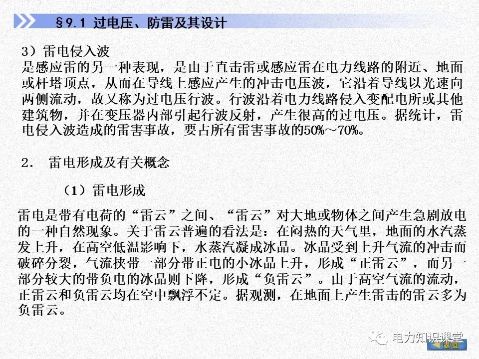 1.过电压是指电气设备或线路上出现超过正常工作要求的电压升高,分为内部过电压和雷电过电压两大类。内部过电压指供配电系统内部由于开关操作、参数不利组合、单相接地等原因,使电力系统的工作状态突然改变,从而在其过渡过程中引起的过电压。雷电过电压是指雷云放电现象在电力网中引起的过电压,雷电过电压一般分为直击雷、间接雷击和雷电侵入波三种类型。遭受直击雷击时时雷电流可高达几百千安,难免灾难性结果,因此必须采取防御措施;高压线路上感应雷可高达几十万伏,低压线路上感应雷也可达几万伏,对供电系统的危害也很大;雷电侵入波造成的雷害事故,要占所有雷害事故的50%~70%。