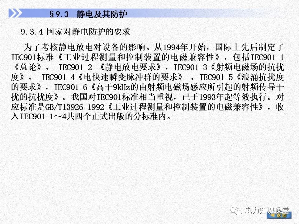 4.静电现象是一种常见的带电现象,在生产和生活中,由于两种不同物质的物体相互磨擦,就会产生静电。静电的特点是静电电量不大而静电电压很高,虽然静电电量不大,不会直接使人致命,但其电压很高,很容易发生放电,出现静电火花,甚至对人体产生电击。静电放电一般通过电磁感应、静电感应、传导耦合和放电辐射等危害电气设备,而且越是精密的仪器仪表,越是高科技的技术,静电的危害越大。防静电方法有:(1)抑制静电放电,(2)抑制静电感应,(3)抑制电磁感应,(4)抑制传导耦合,(5)做好防静电接地工作,采用静电接地,即对设备、管道和容器等进行接地,防止可能产生或聚集的静电荷。