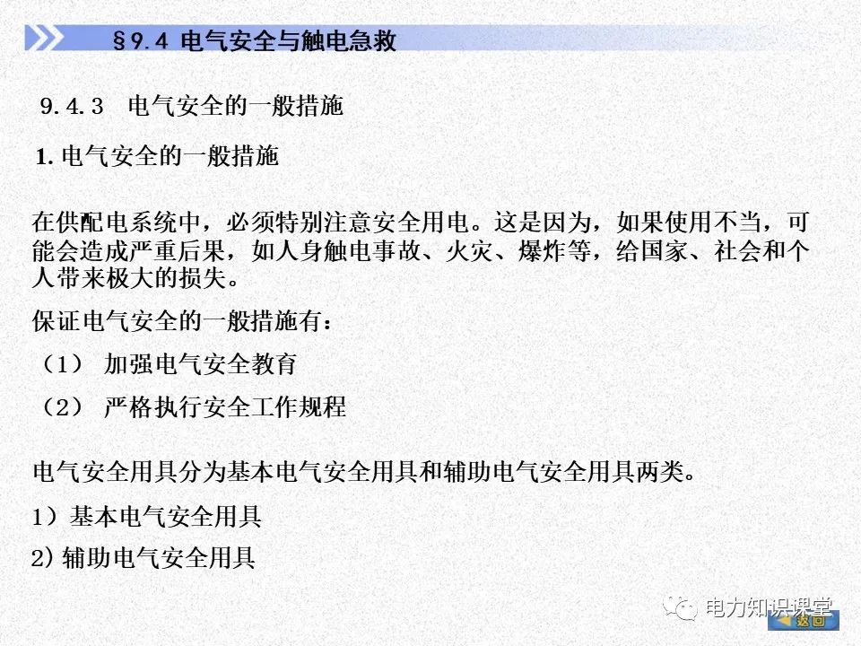 5.第三道防线是防触电死亡措施,是指人身受到电击后,如何减轻其危害程度,不致于有生命危险。安全电流就是人体触电后最大的摆脱电流;安全电压就是不致使人直接死亡或致残的电压。我国安全电流取30 mA,人体允许持续接触的安全电压一般为50V。保证电气安全的一般措施有:(1) 加强电气安全教育,(2) 严格执行安全工作规程,(3) 加强运行维护和检修试验工作,(4) 采用安全电压和和符合安全要求的相应电器,(5) 确保供电工程的设计安装质量,(6) 按规定采用电气安全用具,(7) 普及安全用电常识,(8) 正确处理电气失火事故。触电者的现场急救是抢救过程中关键的一步,为电气工作人员必须具备的条件之一。