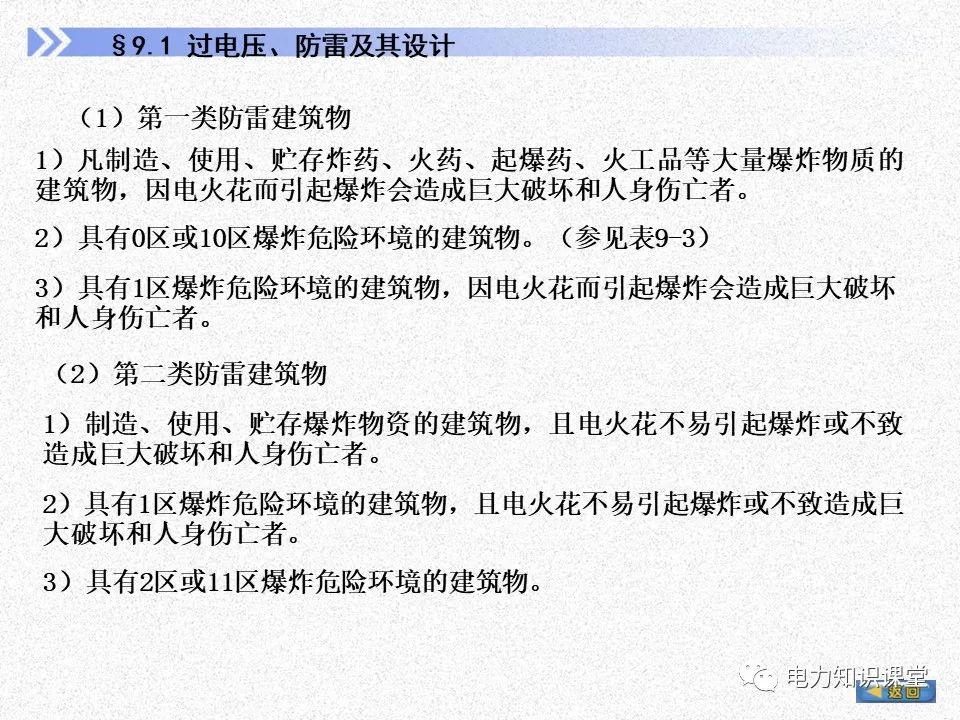 2.防雷装置是接闪器、避雷器、引下线和接地装置等的总和。其中,直击雷的防御一般采用避雷针、避雷线、避雷网等避雷装置;感应雷的防御是对建筑物最有效的防护措施,通常把建筑物内的所有金属物,如设备外壳、管道、构架等均进行可靠接地,混凝土内的钢筋应绑扎或焊成闭合回路;雷电侵入波的防御一般采用避雷器。按防雷要求,建筑物根据其重要性、使用性质、发生雷电事故的可能性和后果,分为三类,并且,各类防雷建筑物采取的防雷措施和要求是不同的。