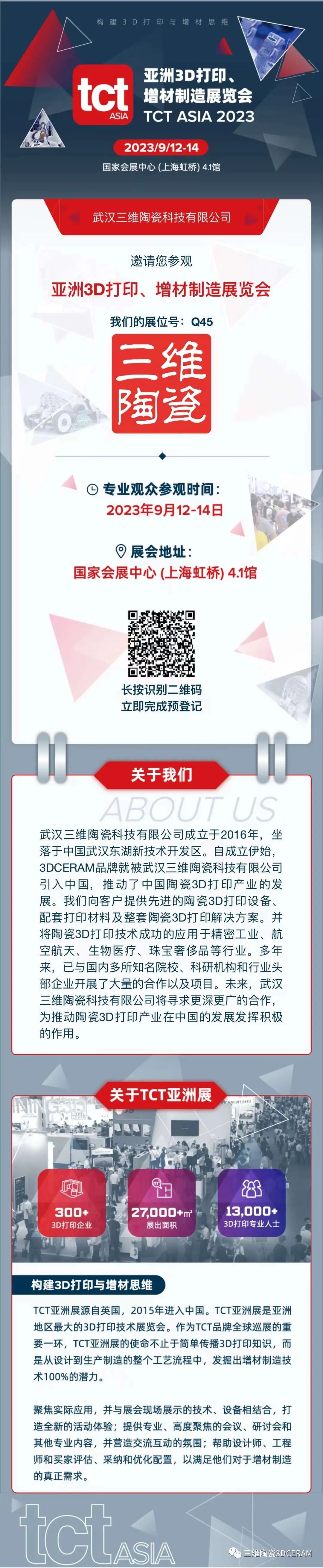 『展会预告』三维陶瓷邀您共赴 TCT ASIA 2023 亚洲3D打印、增材制造展览会