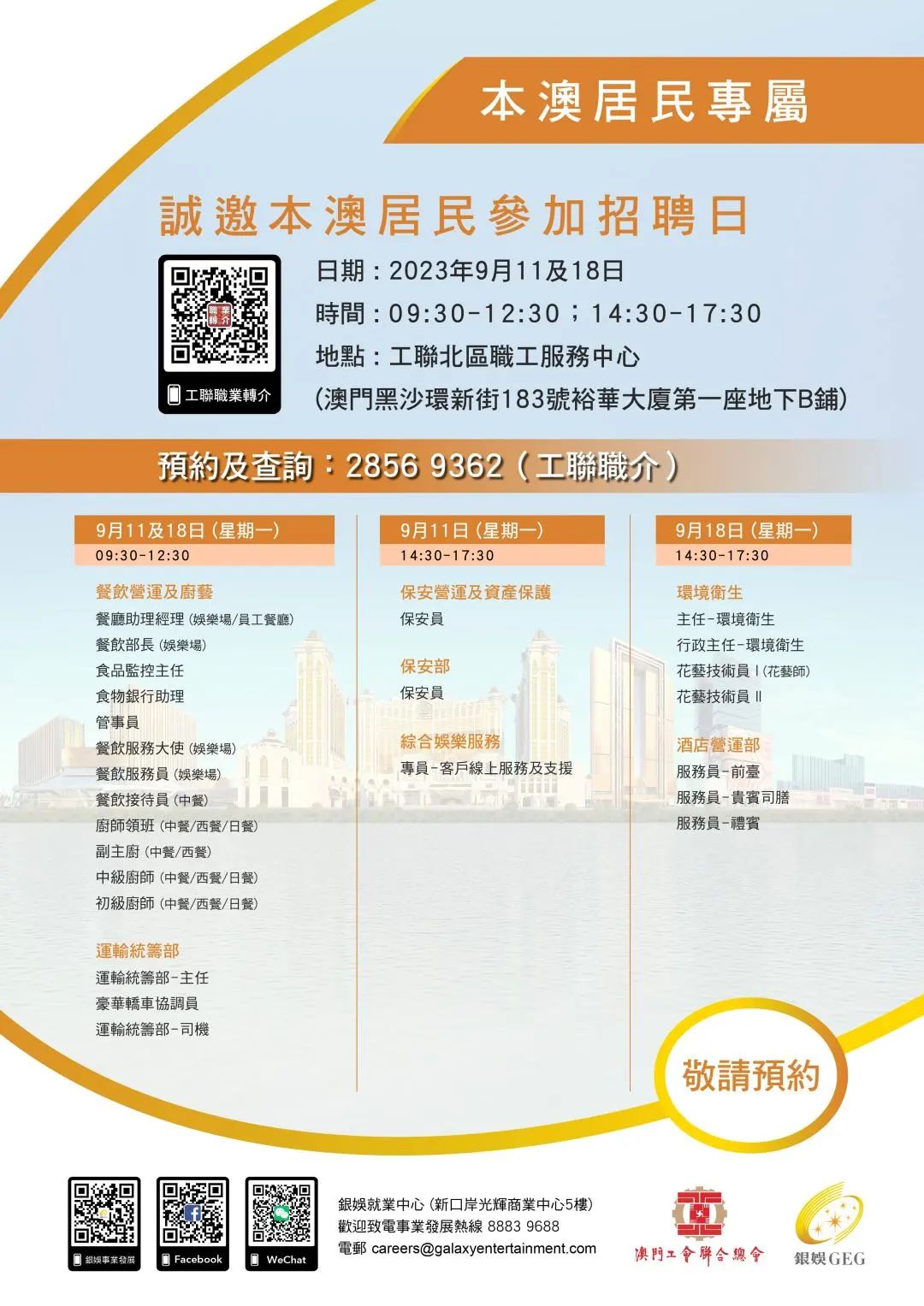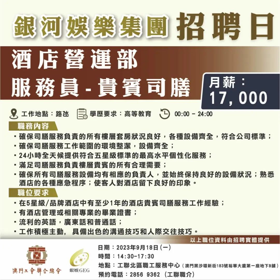 9月11及18日工聯總會與銀河娛樂集團舉辦招聘日,招聘日將提供餐飲營運及運輸統籌、保安、酒店營運及環境衛生等職缺!