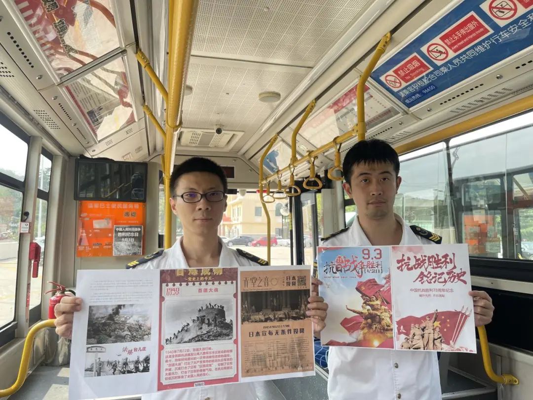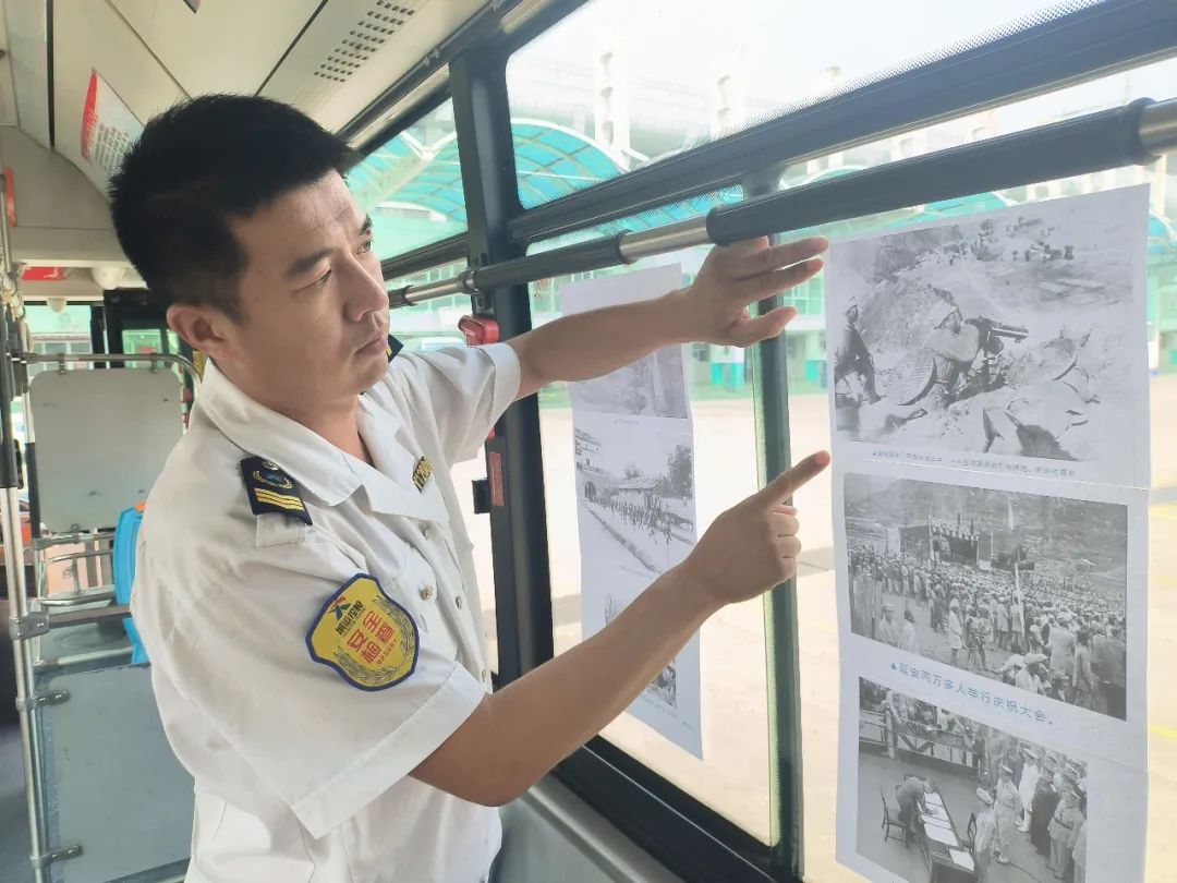 而在605路“纪念抗战胜利”主题车厢上,驾驶员刘一精心准备了多组与抗战历史有关的照片,并且在照片旁标注文字,讲述照片背后的历史知识。“今年是抗日战争胜利78周年,作为一名退伍老兵,我特别有感触,就将车厢布置了一下,弘扬爱国主义精神。”刘一说,他设计的主题车厢,市民们只要上车就可以了解抗战历史,重温抗战故事。