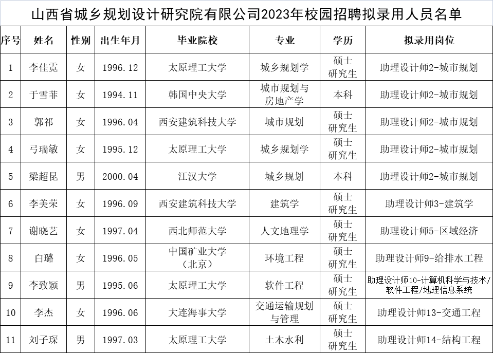 附件:山西省城乡规划设计研究院有限公司2023年校园招聘拟录用人员名单
