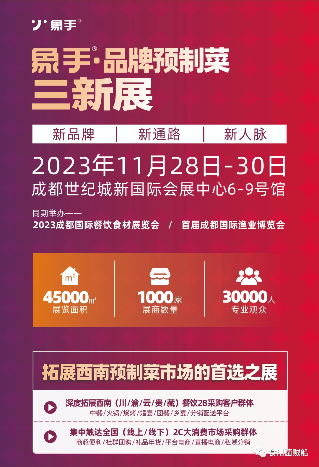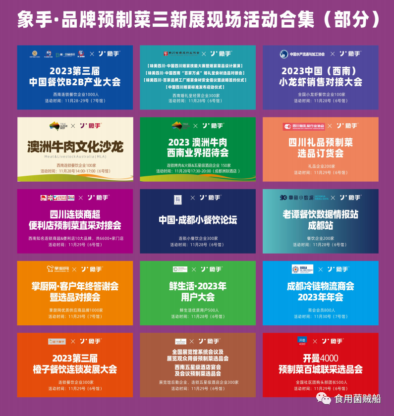 象手·品牌预制菜三新展(新品牌、新通路、新人脉)将于2023年11月28-30日在成都世纪城新国际会展中心6-9号馆举办。经中国食品土畜进出口商会食用菌及制品分会与象手·预制菜未来学社协商决定在三新展期间设立“百企千菌”食用菌主题展区作为第十七届中国蘑菇节的分会场(有关第十七届中国蘑菇节的相关情况我会将另行通知)。本届象手·品牌预制菜三新展展览总规模超45000平方米,届时将有超30000名来自全国范围内的预制菜、餐饮食材专业采购观众到场,是食用菌企业进军西南市场的踏板和桥梁,是食用菌企业进入预制菜和餐饮领域的绝佳展示舞台。