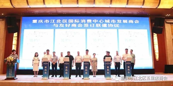 会议期间,举行江北区国际消费中心城市发展商会与五里店商会缔结友好商会签字仪式。五里店商会副会长兼秘书长夏鸿,副会长何莉莉参加相关活动。