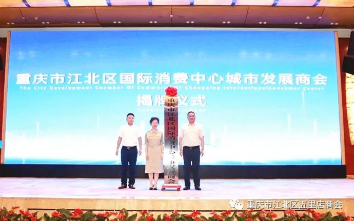 大会现场,重庆市工商联党组成员、副主席雷文睿,江北区委常委、统战部部长雷翌,共同为重庆江北区国际消费中心城市发展商会成立揭牌。