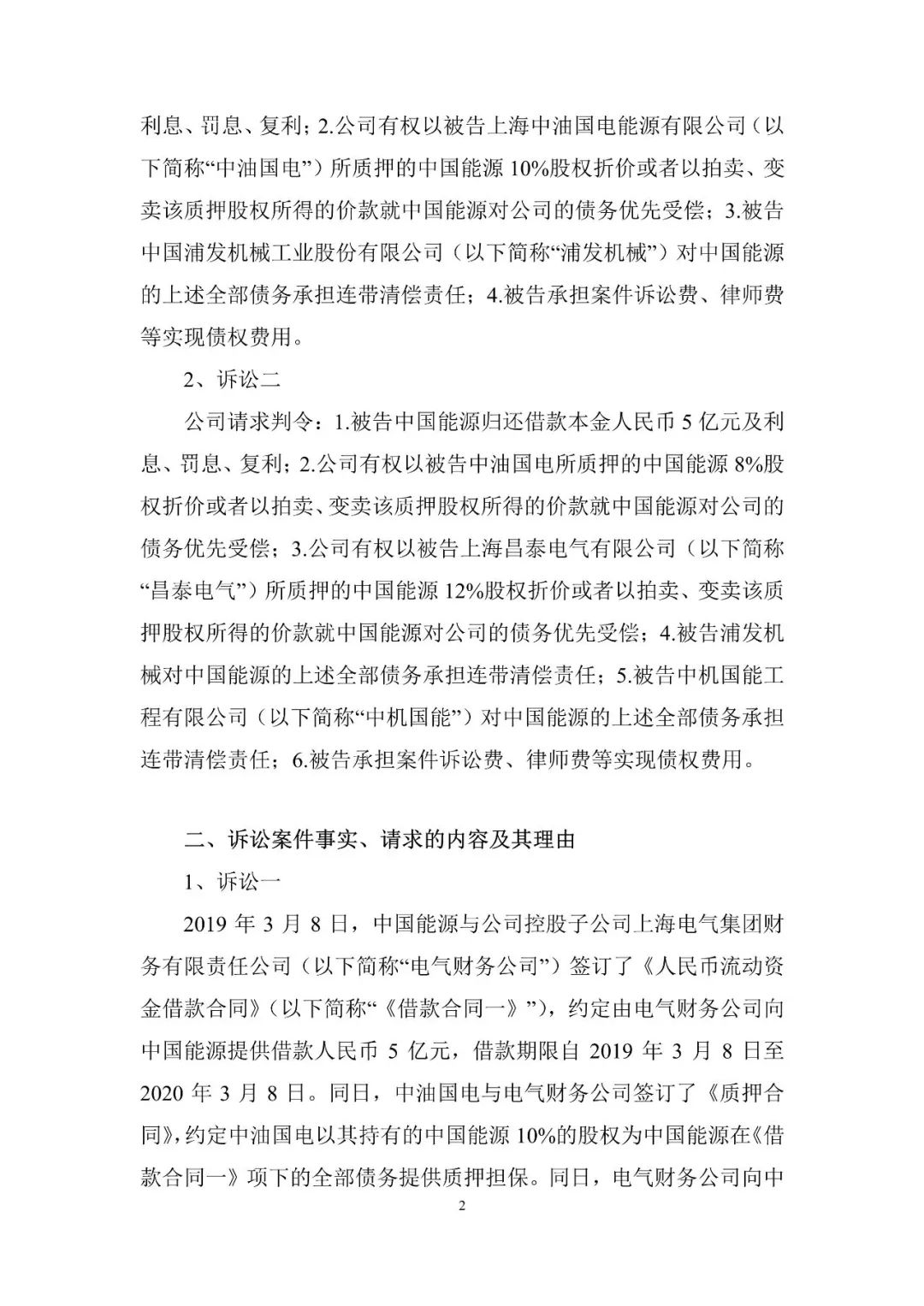 9月4日,上海电气发布公告,于2019年和2020年向中国能源工程集团有限公司提供合计人民币10亿元的借款,后借款方归还本金人民币100万元及部分利息。借款到期后,经催讨,借款方及担保方均未按约履行合同义务。近日公司已向上海金融法院正式提起诉讼,并于2023年9月1日收到《受理通知书》,法院已立案受理。