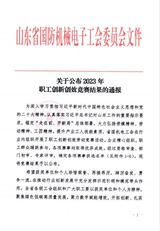 近日,山东省国防机械电子工会委员会印发《关于公布2023年职工创新创效竞赛结果的通报》,高新区总工会推荐的以下个人和集体荣获佳绩:
