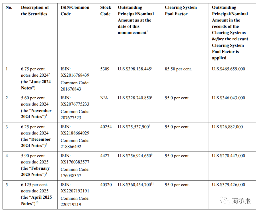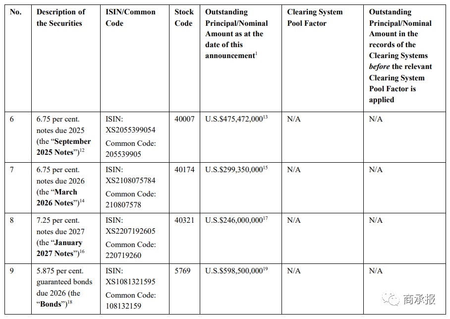 公告称,发行人和担保人正征求持有人同意,以对相关票据进行修订和豁免(其中包括将各系列证券的到期日延长四年、将预定赎回若干系列证券未偿还本金/面值的5%的日期推迟三年、在2023年7月1日至2025年6月30日期间的任何利息支付日按相关PIK利率支付PIK利息(以代替按当前利率支付的现金利息),以及豁免证券在修订生效日可能已发生或可能持续存在的任何潜在或实际违约(包括任何不付款)),此举有助于改善集团整体财务状况和现金流,并解决流动性问题。