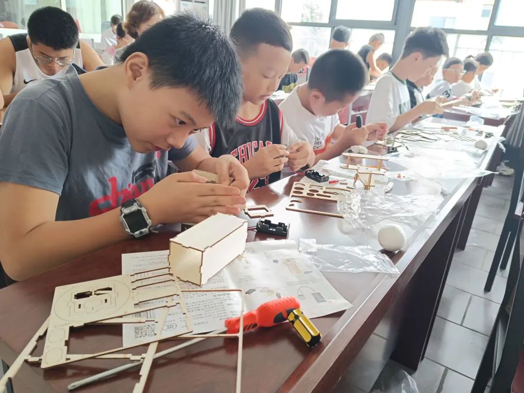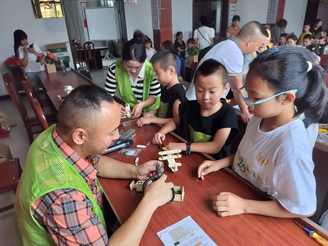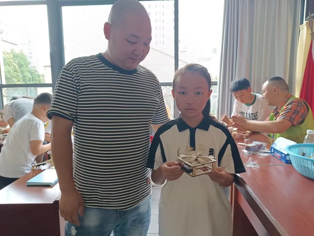 大家聚精会神地听着讲解,亲子之间相互交流、相互帮助,按照操作步骤动手组装。通过把材料中木质卡板榫卯结合、底盘毛刷粘贴固定,最后电机连接电池,一个简易版的扫地机器人就成了。志愿者积极解决孩子们的问题,协助孩子们将科创手工一一组装完成。