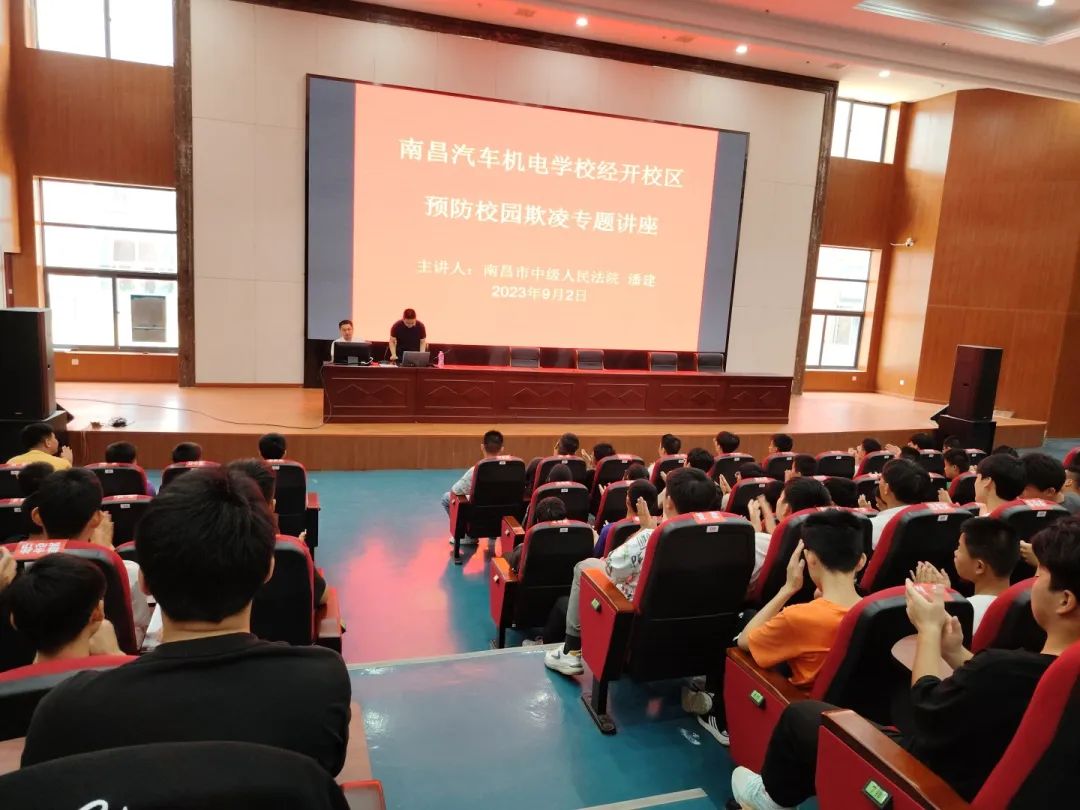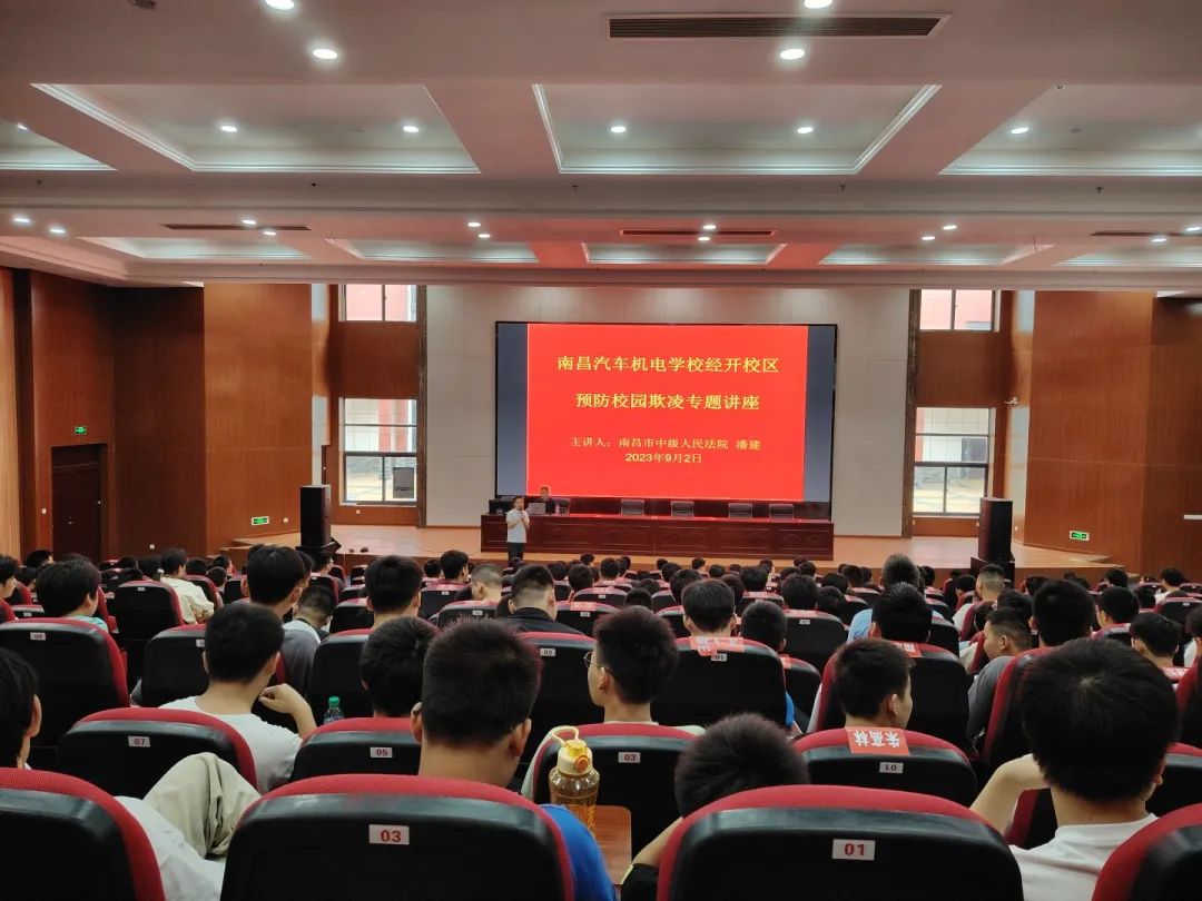 为进一步提高学生法治意识,构建和谐校园环境,预防校园暴力与欺凌事件的发生。9月2日,南昌汽车机电学校经开校区特邀学校法治副校长南昌市中级人民法院潘建法官为2023秋季新生开展了“预防校园欺凌,拒绝校园暴力”为主题的专题讲座。