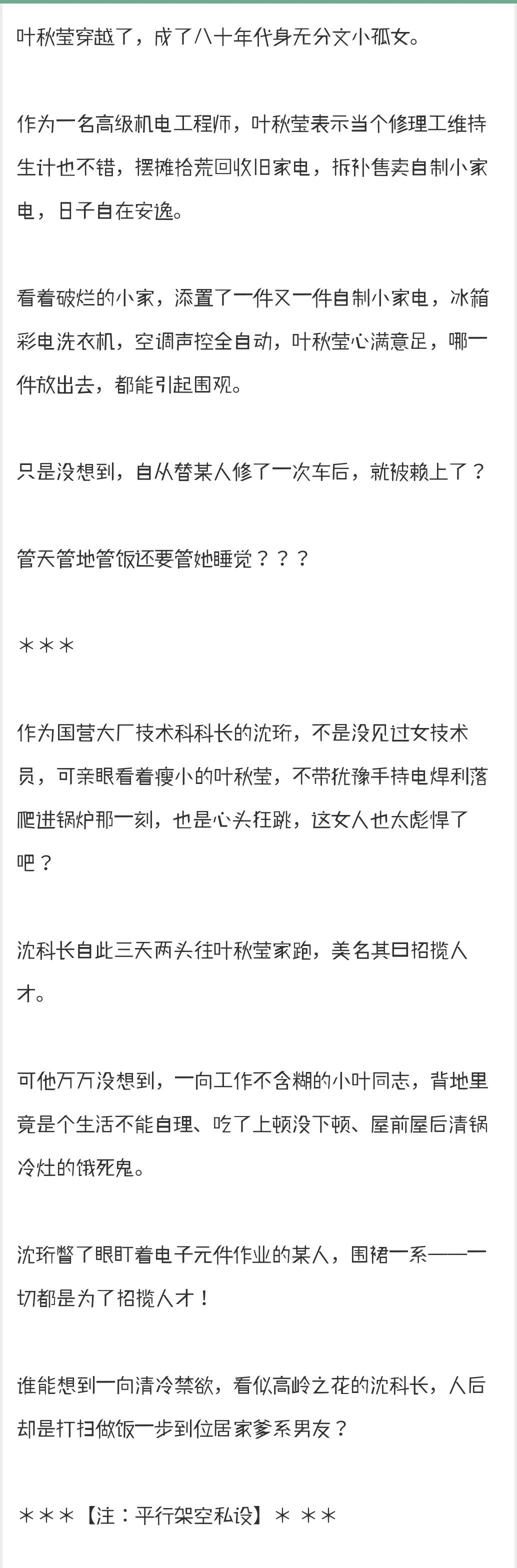 女主穿越成了父母过世的孤女,家徒四壁,身无分文,女主为了吃饭生活直接用起前世的专业技能在这个世界当起维修、改造旧电器、小家电的维修工。之后因为一台改装的收音机认识了一对小夫妻,三人合计一起创业,开了一家集维修改装、二手贩卖、组装贩卖家电的维修店,收入蹭蹭长,后来更是买地建厂,来办民营企业。