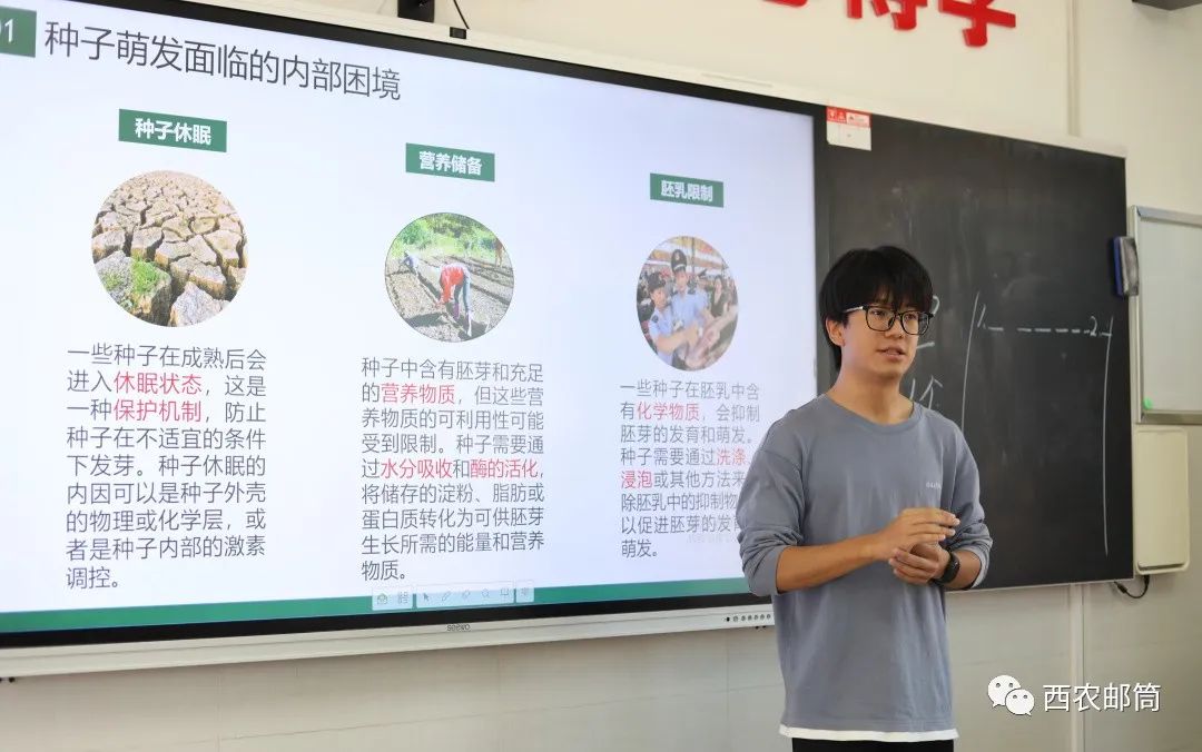 简单的自我介绍过后,本次课堂就正式开始了。首先志愿者们通过对林巧稚的介绍引出农业界颇具影响力的人物——袁隆平先生,进而对农业问题展开了具体讲解。期间同学们积极和志愿者们进行提问互动,发表着各自对农业活动的看法,真是好不热闹。紧接着志愿者们借对种子萌发内外环境的需要引发了大家的头脑风暴:对农业发展面临的内部和外部挑战的思考。后来,我们向同学们介绍了著名的杂交水稻之父袁隆平先生和小麦育种专家赵洪璋院士,就其所作出的贡献以及其所获得的荣誉作出详细讲解,同时讲诉了赵洪璋老先生倾其毕生精力诠释的承远古神农后稷之志、行当代小麦育种富民强国的“西农故事”。
