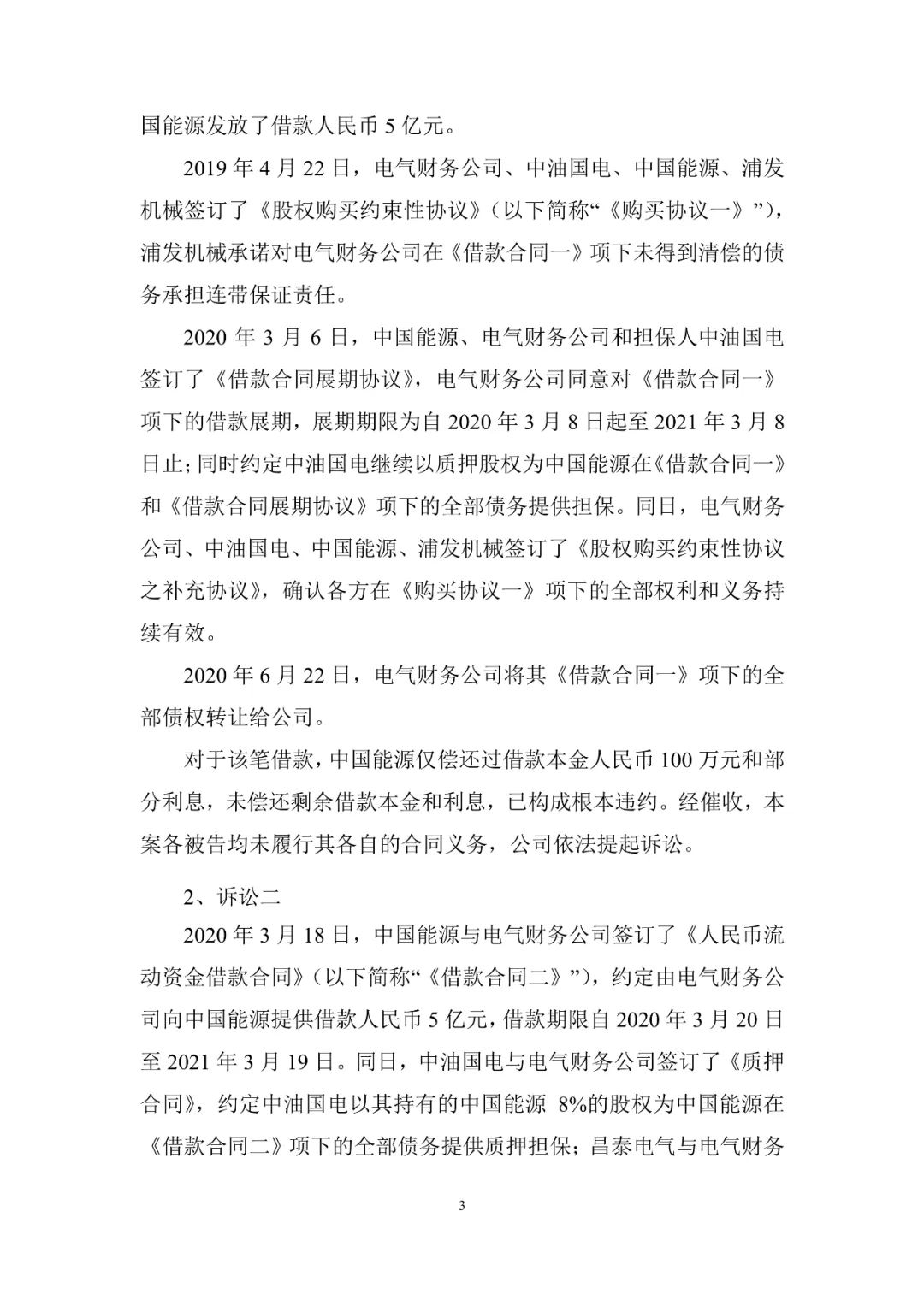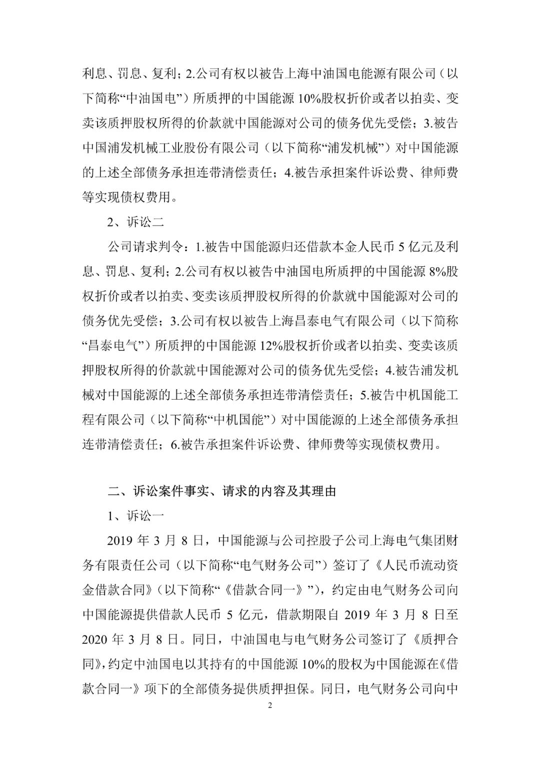 9月4日,上海电气发布公告,于2019年和2020年向中国能源工程集团有限公司提供合计人民币10亿元的借款,后借款方归还本金人民币100万元及部分利息。借款到期后,经催讨,借款方及担保方均未按约履行合同义务。近日公司已向上海金融法院正式提起诉讼,并于2023年9月1日收到《受理通知书》,法院已立案受理。
