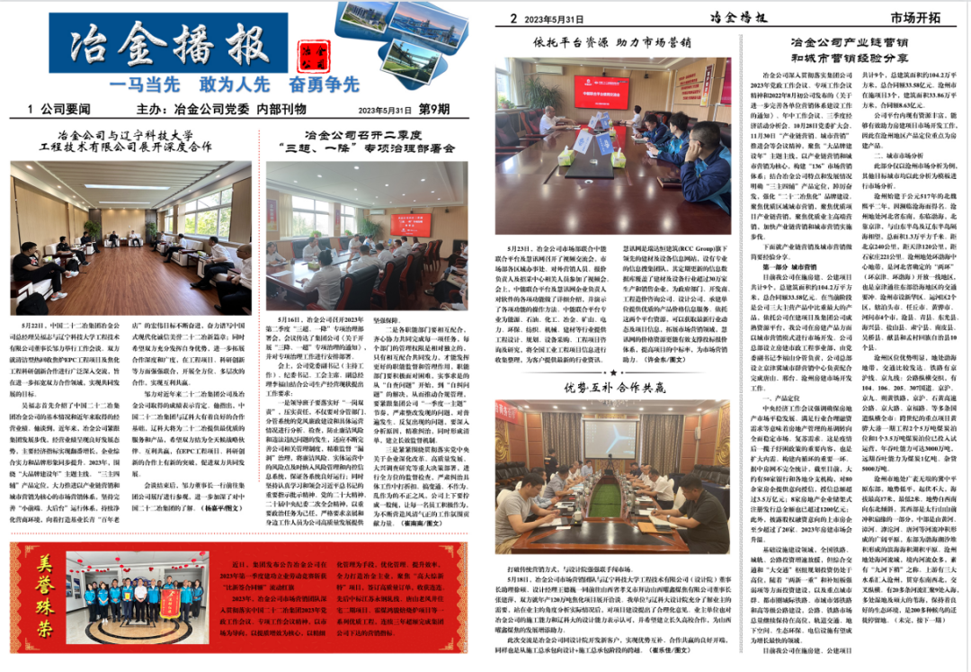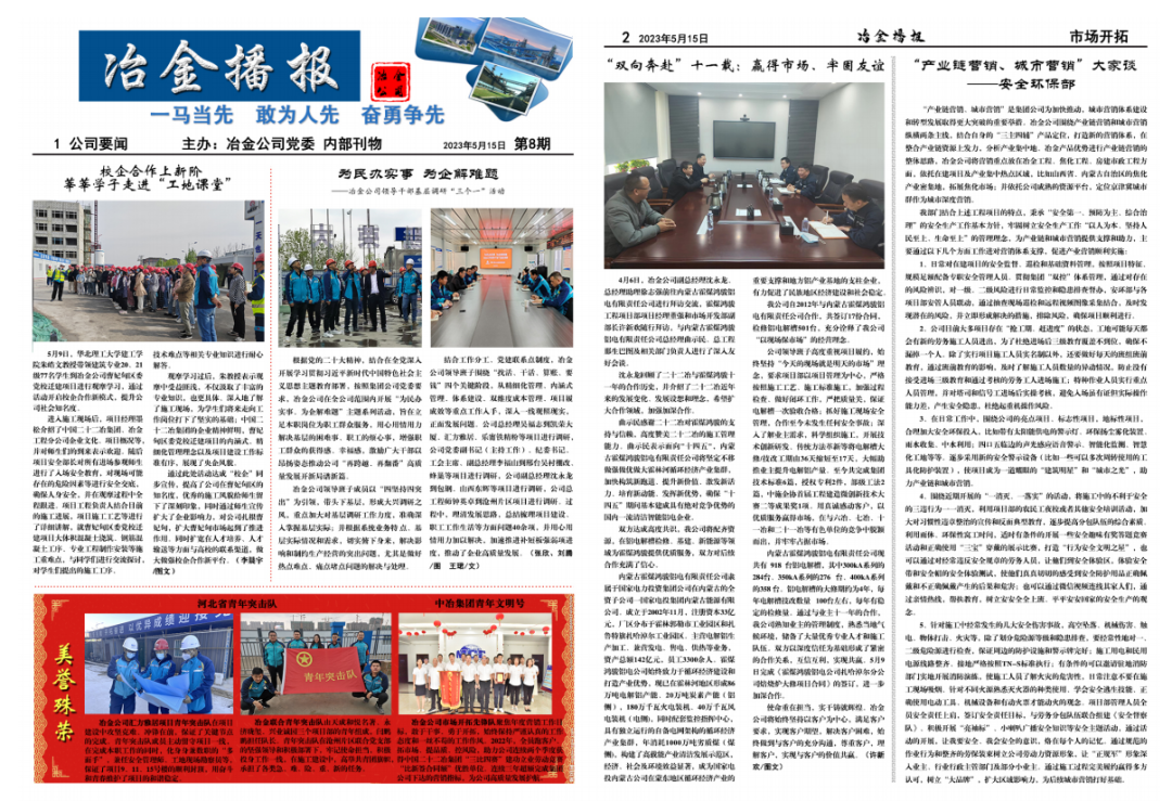 《冶金播报》自发布以来,内容涵盖公司生产经营各个方面,宣传公司重大决策及重要事件,各部门、各项目部踊跃投稿,充分展示冶金公司新风采,打造出独特的文化阵地。