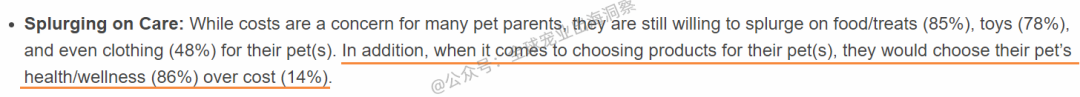根据玛氏kinship《现代宠物主报告》分析的数据,在购买产品时,85%的宠物主愿意在食品和零食,及75%的宠物主在玩具上支付额外费用,48%的宠物主表示他们甚至会为宠物购买衣服。值得关注的是,86%的宠物主表示将宠物的健康和保健置于成本之上,只有14%的宠物主会先考虑成本。