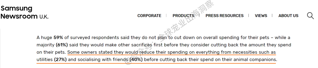 在欧洲:根据三星公司对6500名宠物主进行的一项调查,59%的受访者表示,他们不打算减少宠物的总体支出,61%的宠物主会先做出其他牺牲,然后再考虑减少在宠物上的支出。这其中,40%的宠物主表示,宁愿牺牲社交活动,27%的宠物主节约水电费等必需品,也不愿意削减宠物开支。