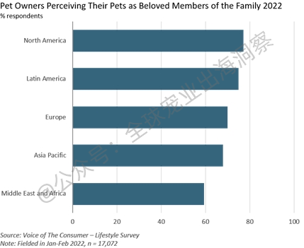 根据欧睿国际(Euromonitor International)的 "消费者之声 "调查,全球71%的宠物主将宠物视为家庭成员,北美第一,欧洲排在第三。拉美、亚太、中东和非洲的这一趋势也在迅速上升。