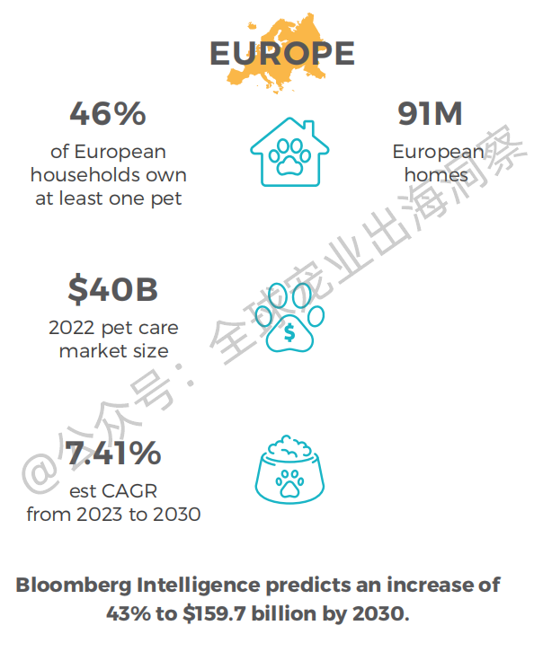 欧洲宠物市场规模:2022年欧洲宠物护理市场规模达400亿美元,2023年至2030年复合年增长率预计为7.41%。