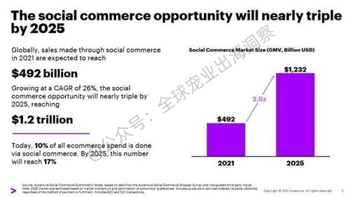 利用直播和社交商务:埃森哲(Accenture)预计,到2025年,全球社交商务市场规模将增长一倍以上,达到1.2万亿美元。