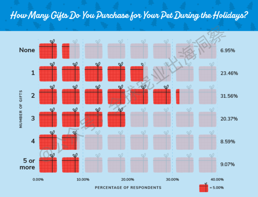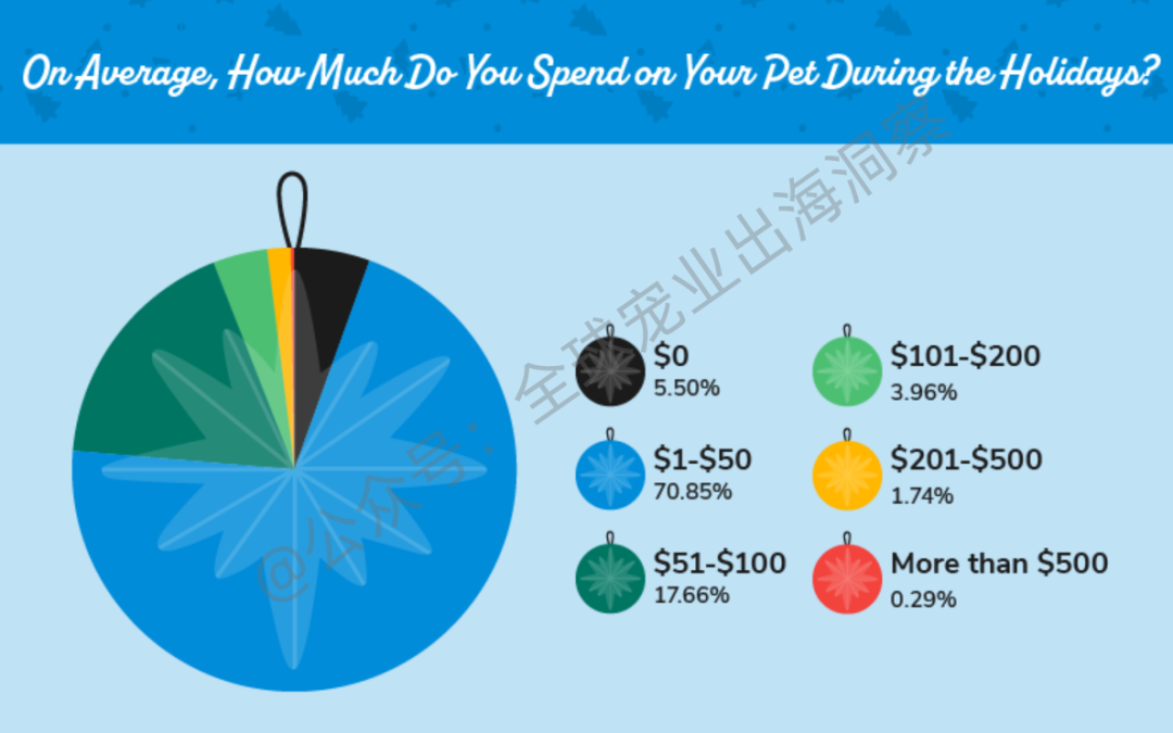 至于宠物的这些礼物和其他节日礼物的平均支出费用是多少?70.85%的美国宠物主支出在1美元到50美元之间,17.66%的支出在51至100美元之间,这在美国范围内引起了广泛关注。
