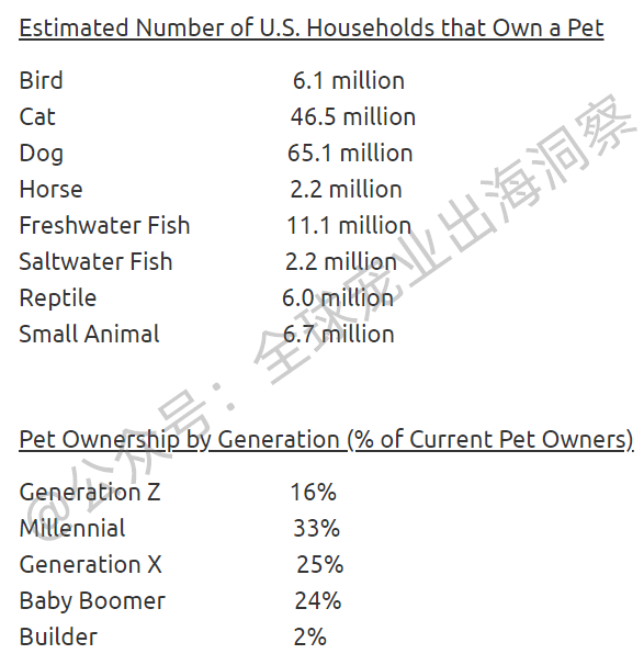 美国家庭宠物拥有率:根据美国宠物用品协会(以下简称“APPA”)最新数据,66%的美国家庭拥有宠物,8690万个美国家庭有一只或多只宠物。