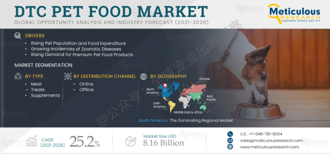 另据市场研究公司Meticulous Research发布的《直接面向消费者的宠物食品市场--2028年全球预测》报告,到2028年,DTC宠物食品市场预计将达到81.6亿美元。报告称,数字渠道的日益普及、对营养宠物食品的需求、千禧一代宠物主,以及消费者为宠物产品支付溢价的意愿增加,都支撑着DTC宠物食品市场的增长。