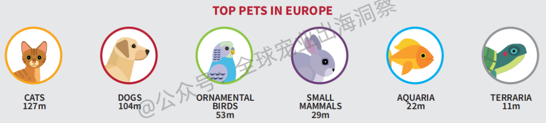 欧洲养宠类型:猫和狗最受欢迎,宠物狗数量约1.04亿只,猫数量约1.27亿只。