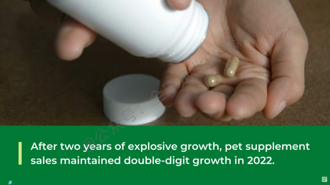 宠物保健品的爆炸式增长:预计宠物补充剂领域的产品将出现大幅增长,Packaged Facts《美国宠物补充剂,第9版》报告显示,对宠物健康和保健的过度关注以及宠物在家庭中扮演的核心角色促使宠物主在整个2022年继续在宠物营养品上消费,推动市场规模略高于10亿美元,比2021年增长11%,在2022年保持了两位数的增长。预计到2027年,美国宠物补充剂零售额将达到14亿美元。