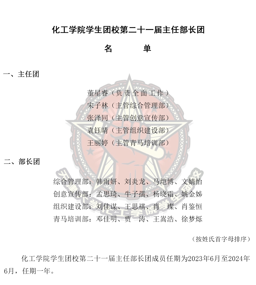 天津大学化工学院学生团校根据学院相关规定,综合上一学年中部门成员的工作表现及能力,经面试选拔后确定2023—2024学年主任部长团名单,现公示如下: