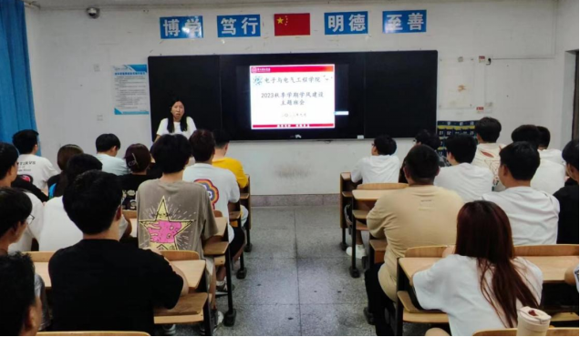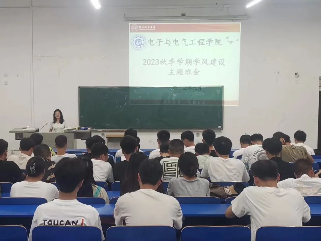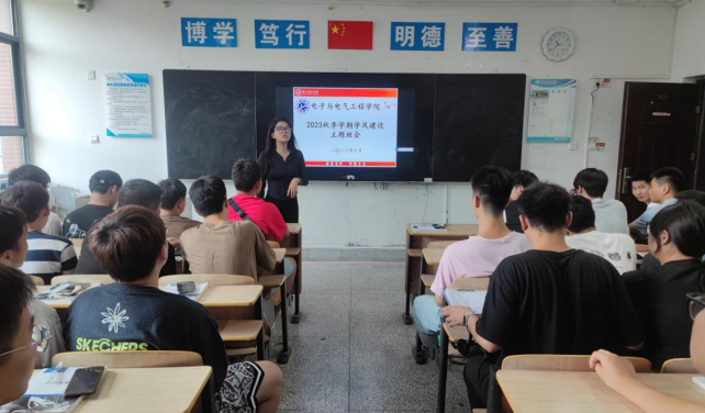 9月5日,电子与电气工程学院辅导员在科教西楼组织学生召开“2023-2024年第一学期学风建设”主题班会,旨在进一步加强学风建设,为大学生的成长成才营造良好的育人环境,增强学生学习的进取性和主动性,促进大学生的健康成长和综合素质的全面提高。